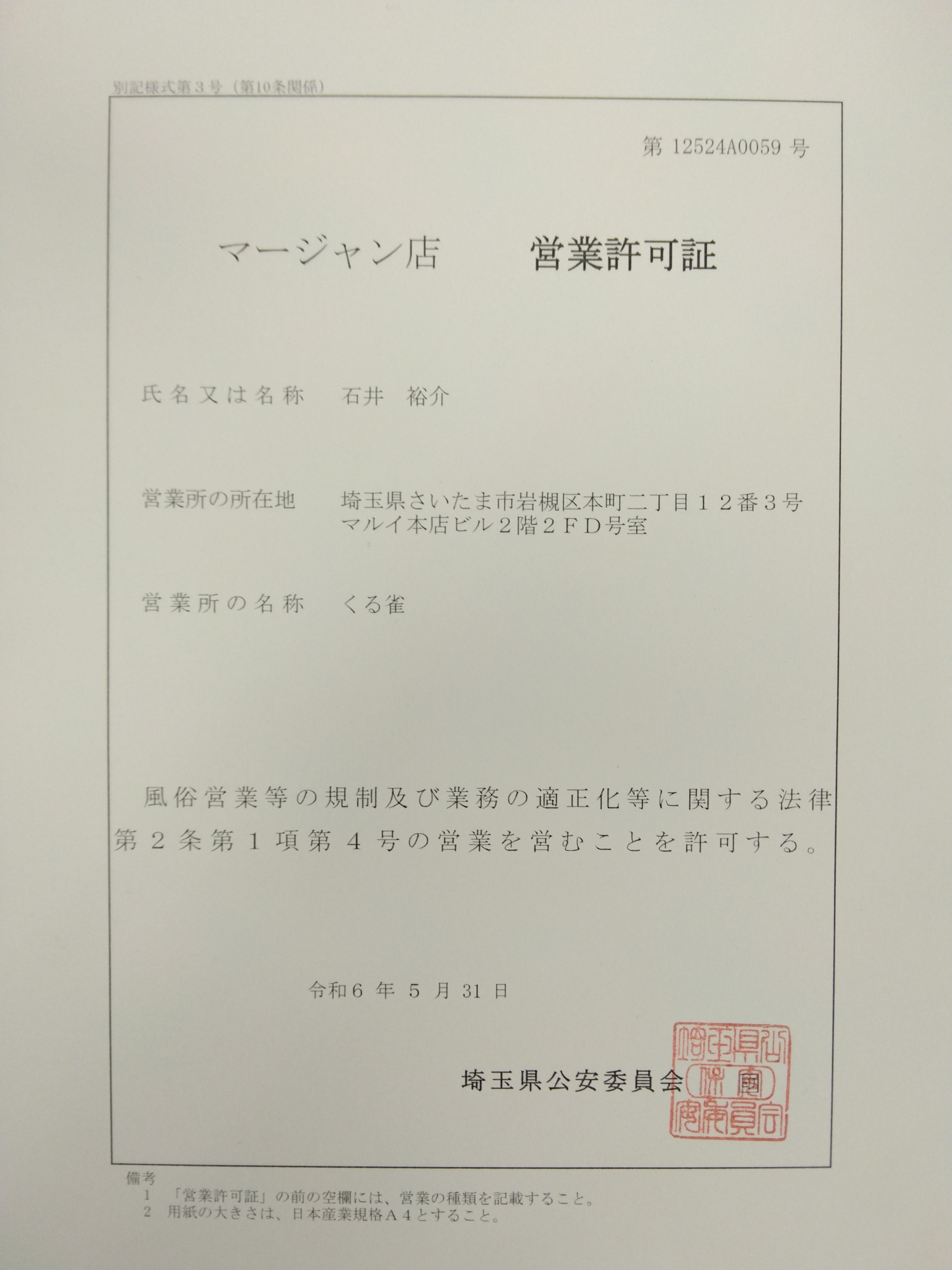 マージャン店の営業許可証